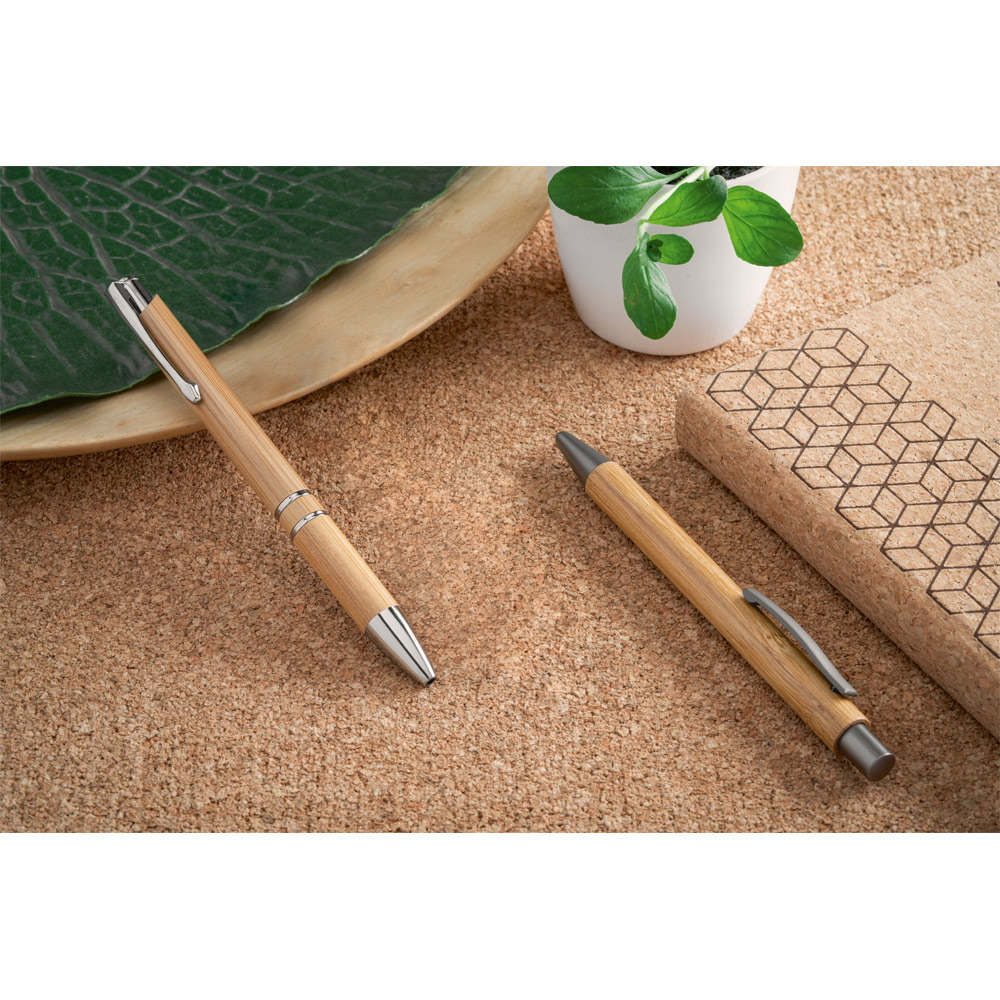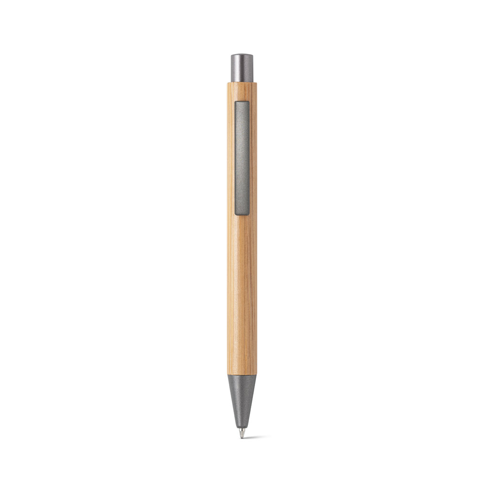 ბამბუკის ბურთულიანი კალამი მეტალის კლიპით. ლურჯი მელანი. პროდუქტი დამზადებულია ბუნებრივი მასალებიდან, ამიტომ ფერი და ბეჭდვის შედეგი შეიძლება განსხვავდებოდეს პროდუქტებს შორის.