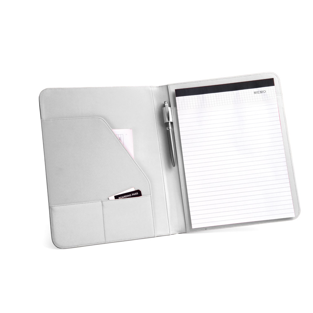 A4 ფოლდერი PU და 800D მასალით, შიგნით მიკროფიბრით. ელასტიური ლენტით იკეტება. შეიცავს 40 ხაზიან ფურცლების ბლოკნოტს (60 g/m²), 3 ჯიბეს და კალმის სამაგრს (კალმის…).