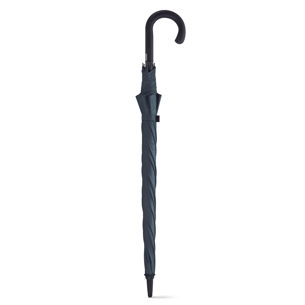 Pongee 190T ქოლგა ფიბერგლასის ღერითა და ფიცრებით, რეზინის საფარიანი სახელურით. ქოლგა ქარისგან დამცავია და აქვს ავტომატური გახსნა. ø1030 x 890 mm
