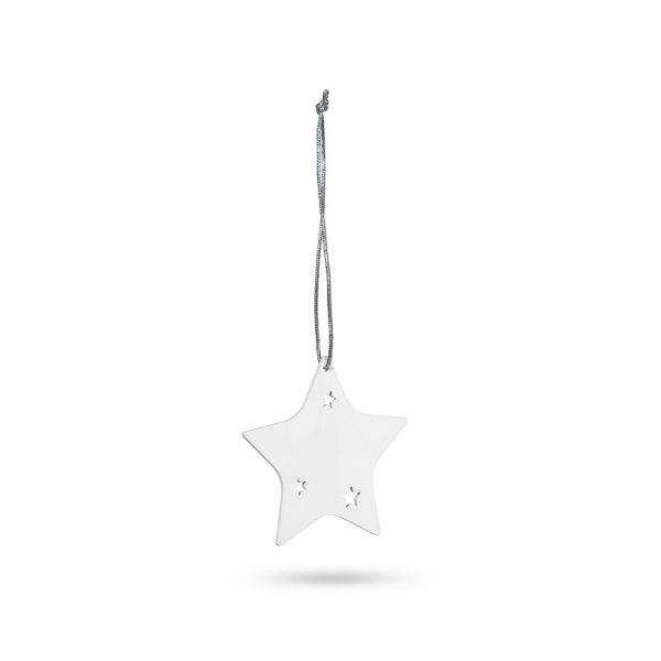 ვარსკვლავის ფორმის ხის საშობაო დეკორაცია. პროდუქტი დამზადებულია ბუნებრივი მასალებისგან, ამიტომ ფერი და ბეჭდვის შედეგი შეიძლება განსხვავდებოდეს სხვადასხვა ერთეულებს შორის. ზომა: 75x78x2,5 mm.