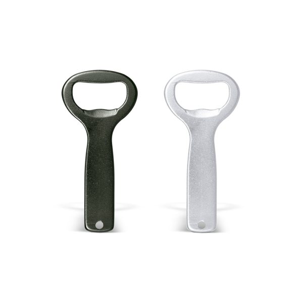 ალუმინის ბოთლის გახსნის ხელსაწყო ხვრელით დაკიდებისთვის. ზომა: 39 x 83 x 4 მმ