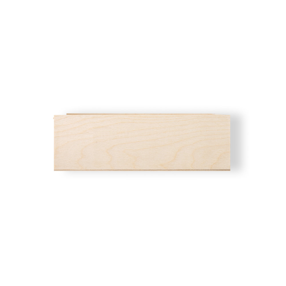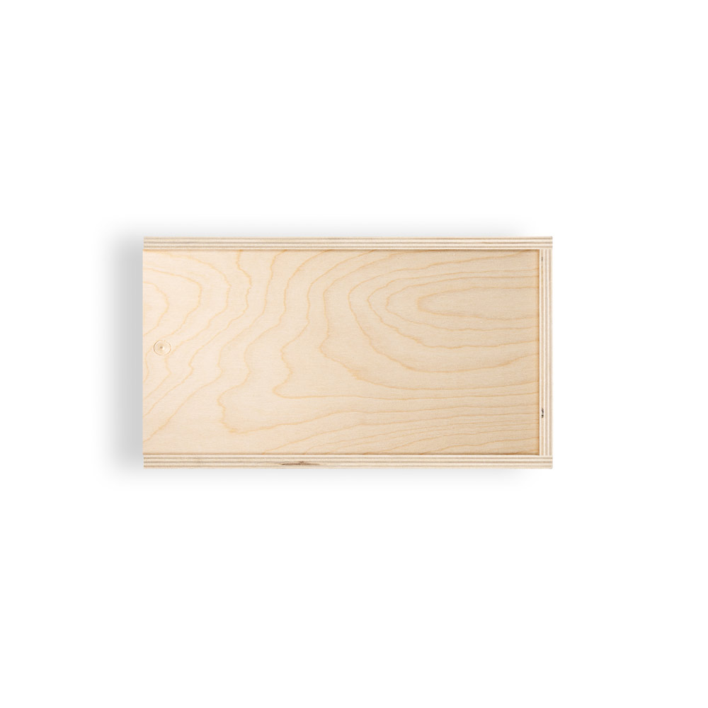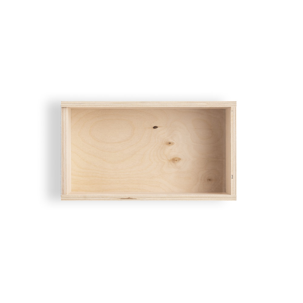 ფანერის ყუთი სრიალებადი თავსახურით, იგივე მასალისგან. ზომა M. შიდა განზომილებები: 290 x 164 x 104 მმ | გარე განზომილებები: 309 x 189 x 118 მმ