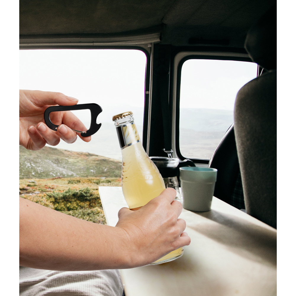 ალუმინის კარაბინერი ბოთლის გახსნით. პროდუქტი არ არის შესაფერისი ცოცვისთვის. ზომები: 79 x 44 x 8 მმ.