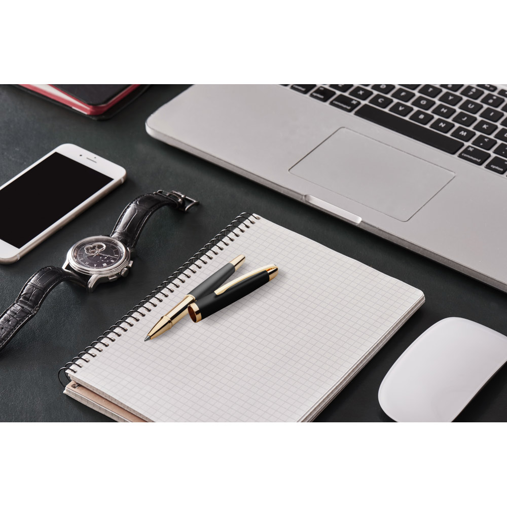 მეტალის როლერი ოქროს დეტალებით. ლურჯი მელანი. შეფუთულია კრაფტის ქაღალდის ყუთში ø11 x 140 მმ | ყუთის ზომა: 180 x 43 x 22 მმ