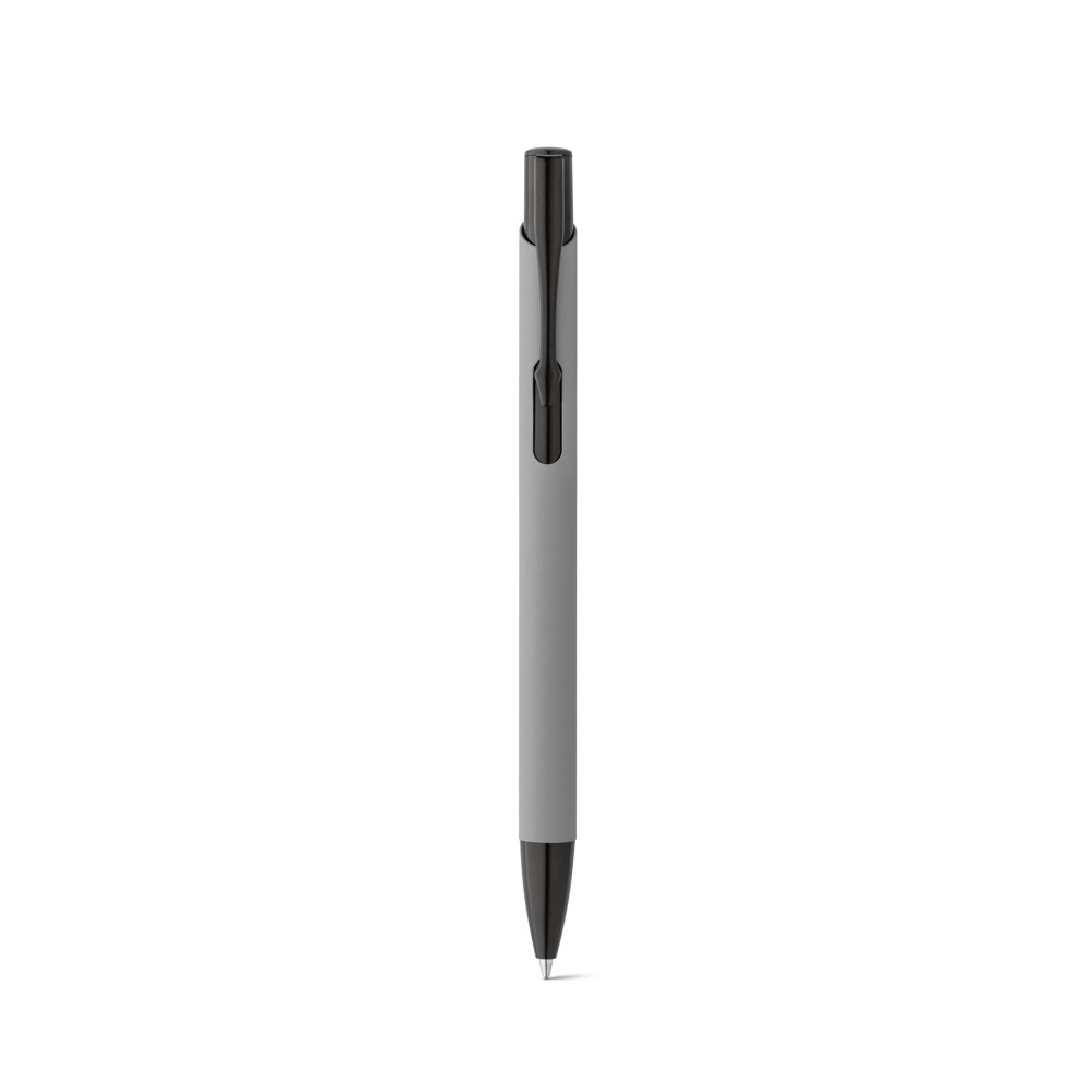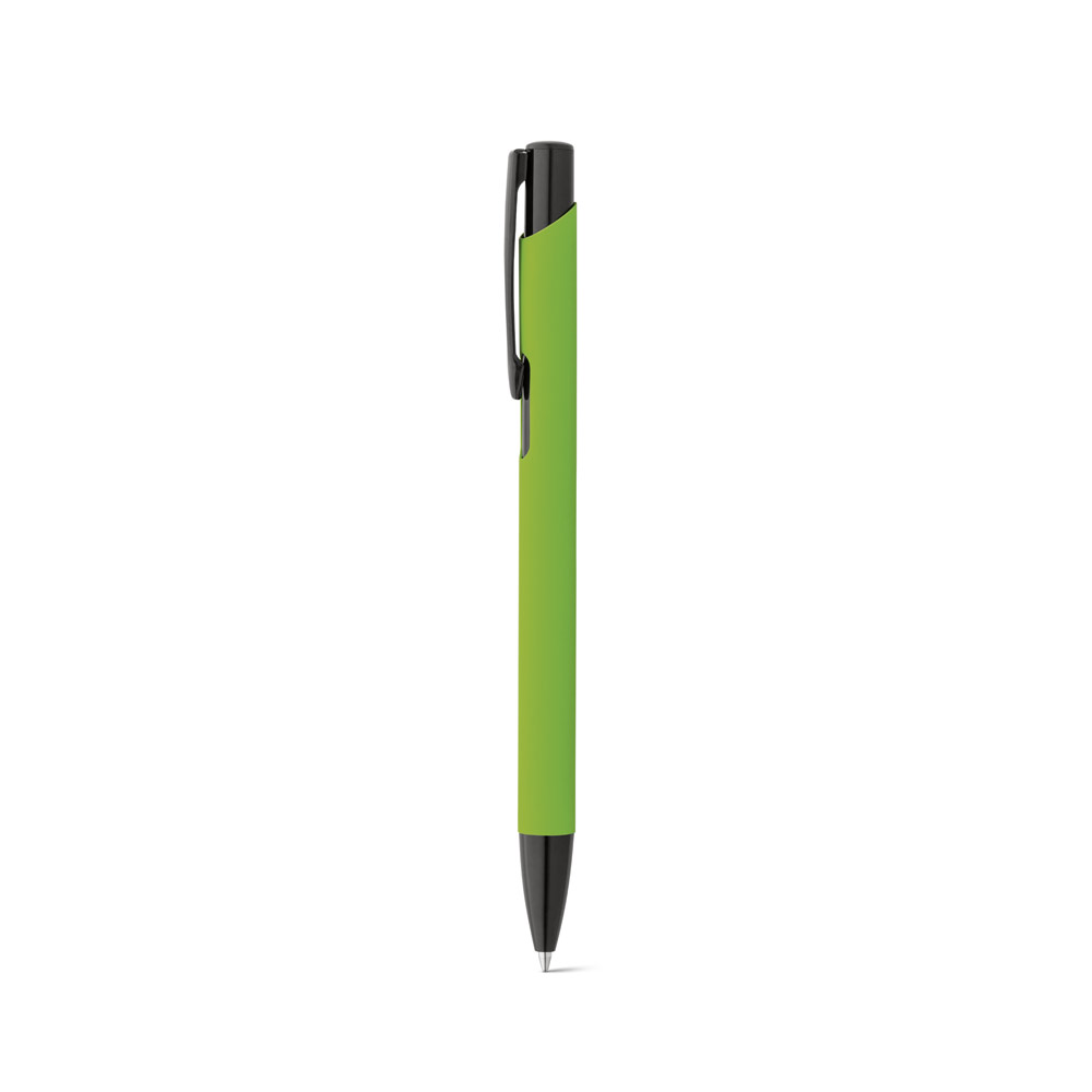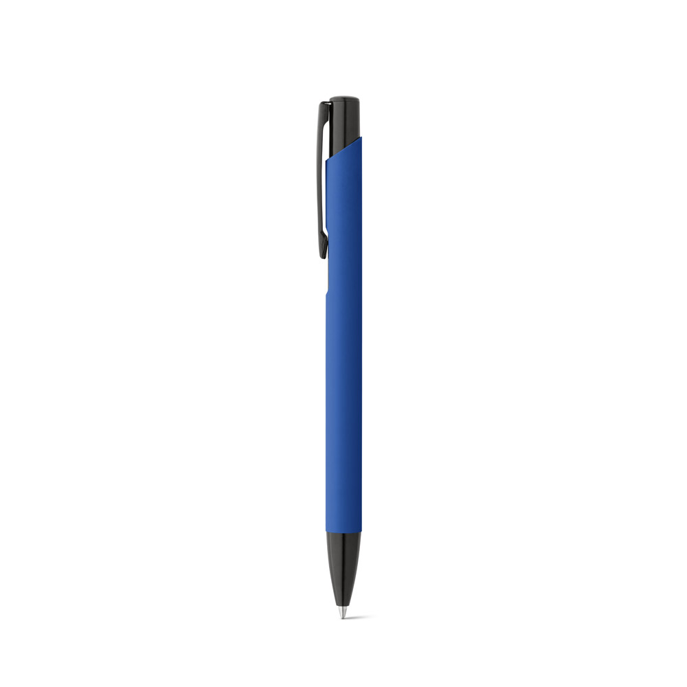 ალუმინის ბურთულიანი კალამი ფერადი კორპუსით და რეზინის საფარით. ლურჯი მელანი. ø10 x 137 მმ