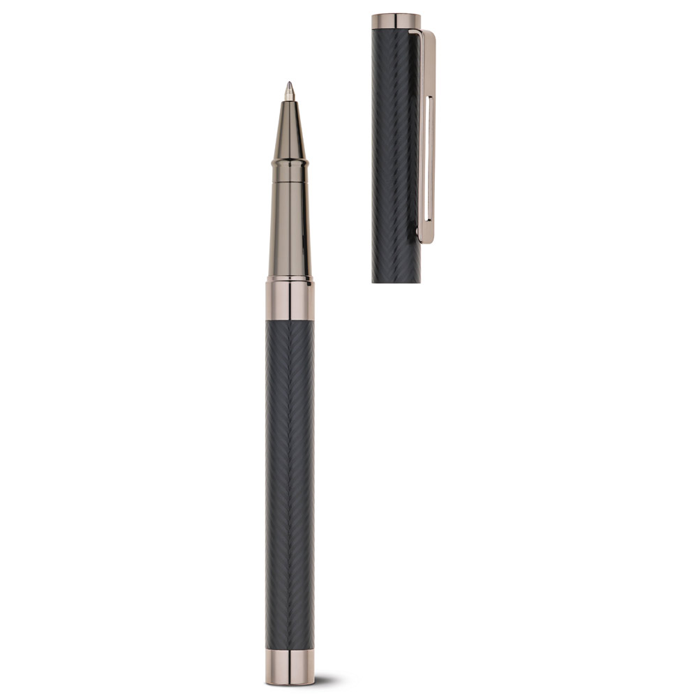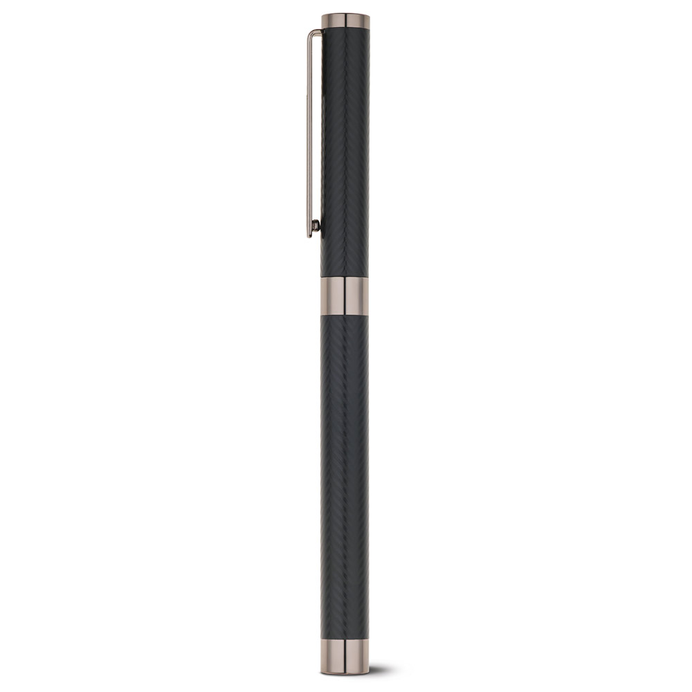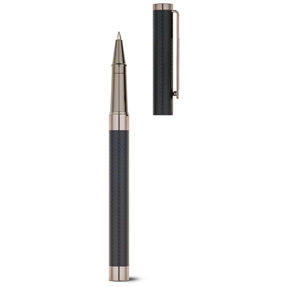 მეტალის როლერი მქრქალი შავი ზედაპირით და უჟანგავი ფოლადის კლიპით. შევსება არის Dokumental Ink® შავი წერისთვის. ø10 x 135 mm