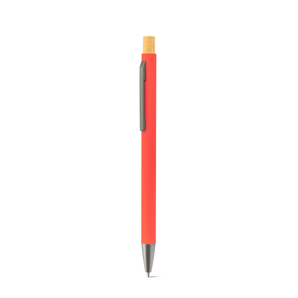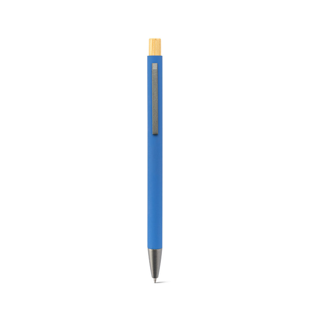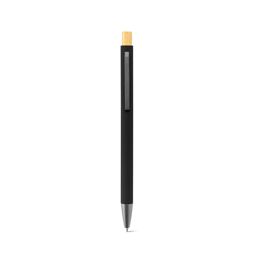 რეციკლირებული ალუმინის ბურთულიანი კალამი (100% RAL) რეზინის საფარით. მისი მინიმალისტური დიზაინი აერთიანებს მატე მეტალიკურად ნაცრისფერ დეტალებს და ბამბუკის ღილაკს ზედა ნაწილში. მას აქვს…